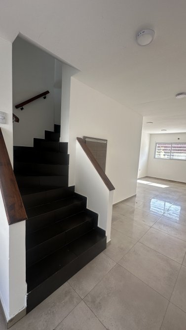 En la planta alta se encuentran dos dormitorios espaciosos, uno de ellos con balcón y vista al frente. El baño completo ofrece un diseño moderno y funcional. Los detalles de calidad incluyen pisos de porcelanato y paredes revestidas en yeso, proporcionando un ambiente elegante y acogedor en toda la vivienda.