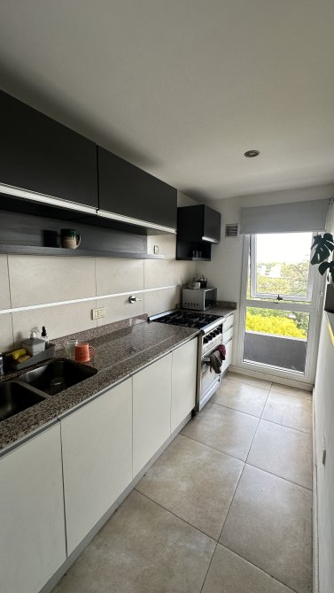 • Cocina integrada con barra desayunadora, sector muy práctico y cómodo, muebles bajo y sobre mesada, y artefacto de cocina incluido.