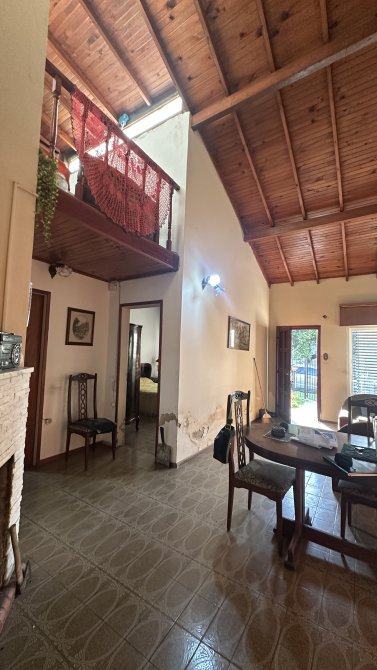 La propiedad cuenta con un amplio living-comedor con techos en gran altura y hogar a leña, dos dormitorios con pisos de parquet y un baño completo de generosas dimensiones con espacio de guardado. Uno de los dormitorios dispone de escalera hacia un entrepiso multifunción, ideal como escritorio, biblioteca o sala de estudio.
